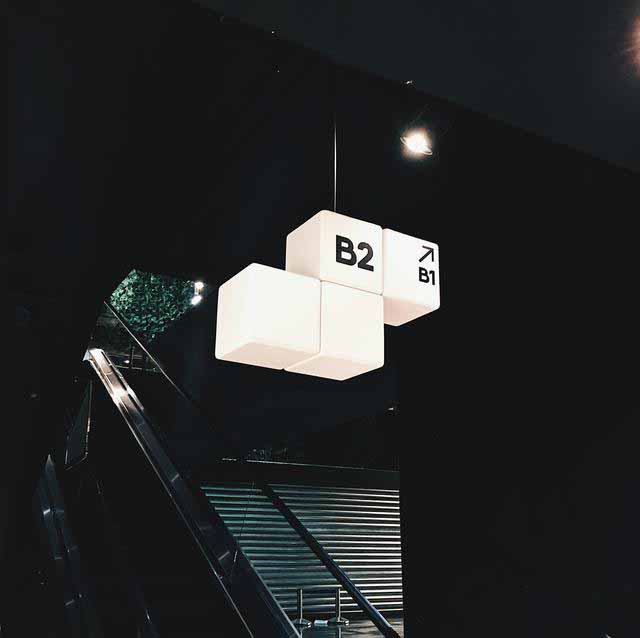 商場吊牌都采用了三聚氰胺板制成的正方體塊相組合的形式展示,多樣的組合形式讓它形式多變但風格統一,配合以簡潔的標識,成為裝飾它的一部分。讓它很好的融入了整個環境中,有沒有很像俄羅斯方塊!